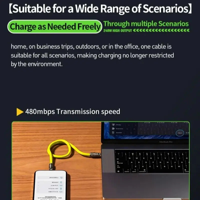 Made with durable silicone splicing technology, the cable is strong, flexible, and resistant to bending, ensuring long-lasting performance. With a 240W high-power output, it supports super-fast charging for laptops, tablets, and smartphones, while also allowing efficient data transmission.