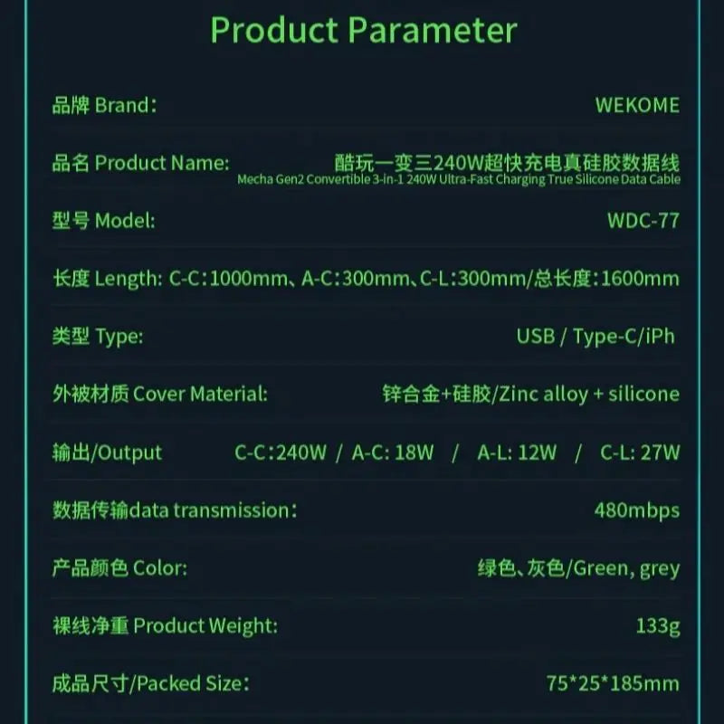 WEKOME 240W 6-in-1 Fast Charging Data Cable – Universal Multi Connector Mecha Design